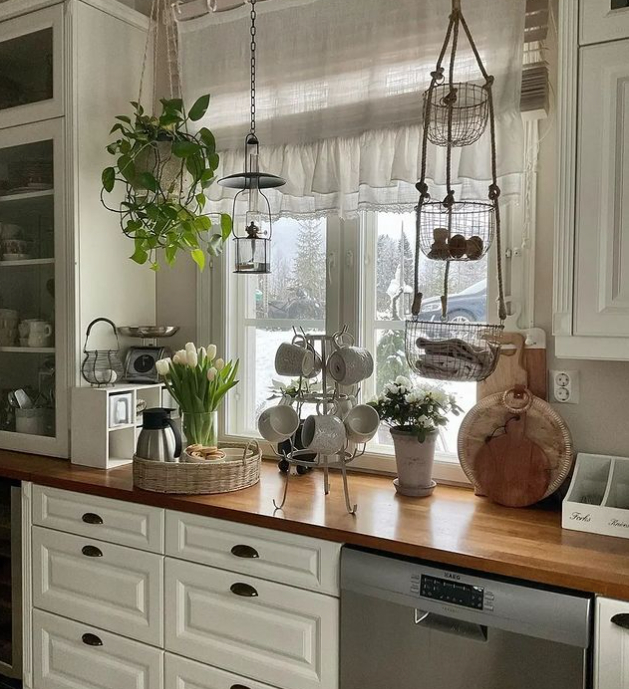 One easy and affordable DIY project that will add a touch of cottagecore to a corner of your kitchen is this hanging basket featured by @arteperpiacere.