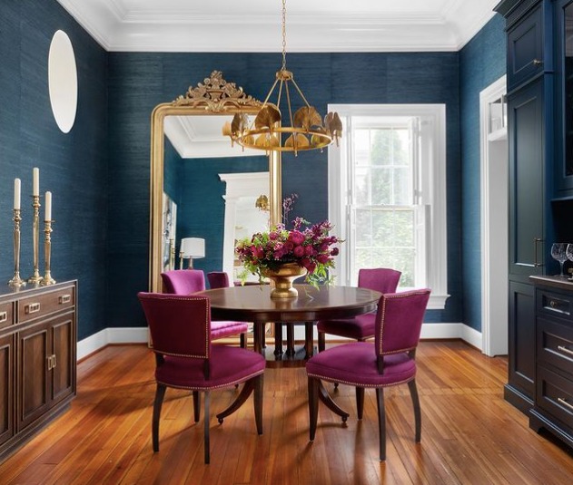 “We have fully leaned into the trend of saturated, moody spaces,” says designer Elizabeth Ryan. “A deep color in the dining room can simultaneously be calming and elegant. It works best if everything—the ceiling, trim, and walls—gets the same hue.”