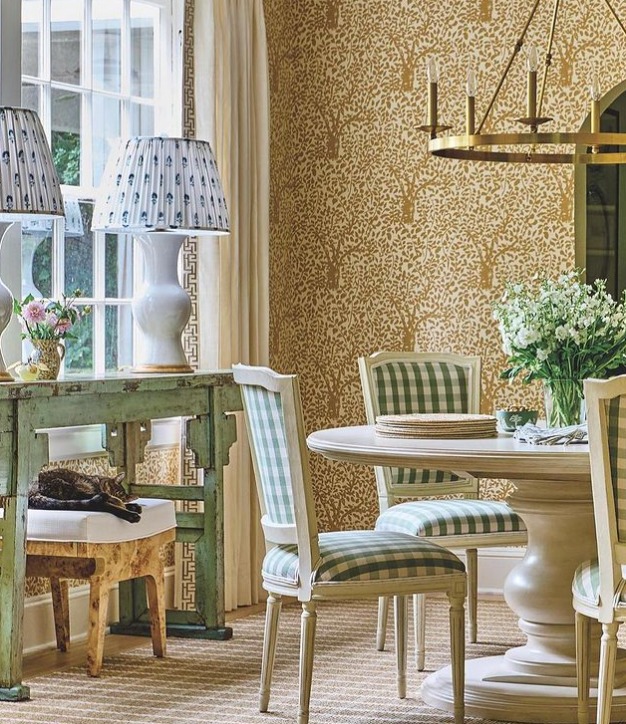 We’re willing to bet that gingham will never go out of style, but lately it seems like it’s one of the must-have patterns in traditional, transitional, and farmhouse-style homes. The royal blue and white tablecloth, seen in a post by @akindofhome, makes a splash in this eclectic dining room.