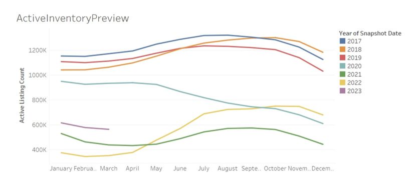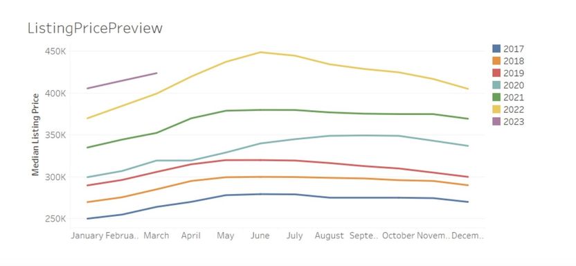 The reality, though, is that home prices are highly cyclical, declining during the wintry off-season then swinging upward in the spring. As such, although listing prices bottomed out at $406,000 in January, they’ve been creeping upward since then, reaching $424,000 in March.