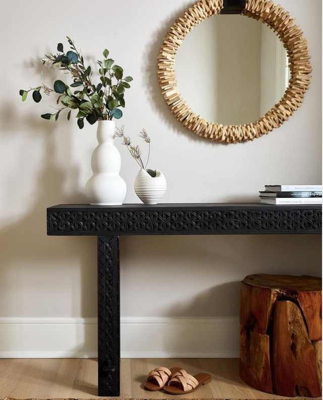 “Textured mirrors are great when you want to add a modern decorative accent,” says Purcell. “Mirrors are known for adding more light and the illusion of space. So pairing a mirror with a strong frame or one with lots of texture can help add grounding properties to your foyer.”