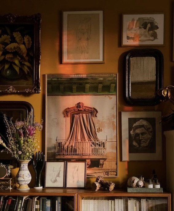 This look layers hints of white and gold with deep red and black for an engaging contrast. Start by painting an accent wall a deep color and place your favorite, largest piece of artwork in the center, then begin to fill it in with smaller items.
