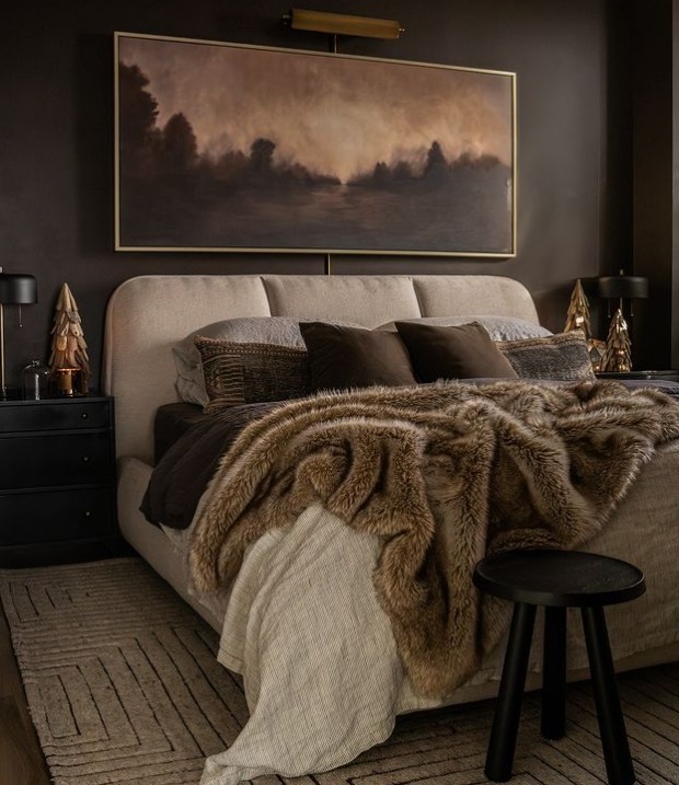 Texture and soft tonal hues make this bedroom so dreamy. Layers of faux furs over organic linens and velvet pillows, against a deep umber wall with a single large piece of artwork gives a masculine yet luxurious feel.
