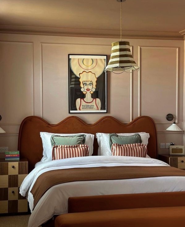 Terracotta-tone is set to take over 2024. This warm, earthy tone paired with a soft, muted blush acts like a photographer's beauty filter. The lush velvet comes to life when paired with classic striped pillows and checkerboard-finish nightstands for a classic modern appeal.
