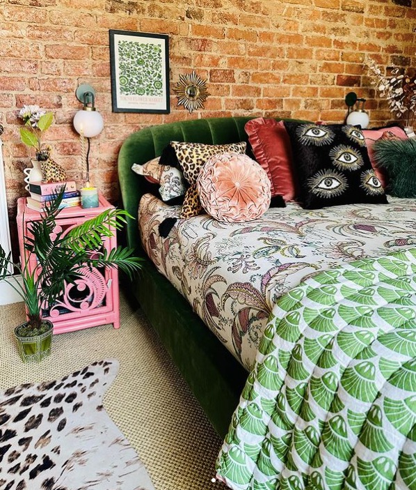 The overall design goal for this room is cozy comfort with layers upon layers of texture and patterns. Velvet headboard, pillows, plants, and an area rug all work together with different iterations of botanical patterns being repeated for a cohesive look.