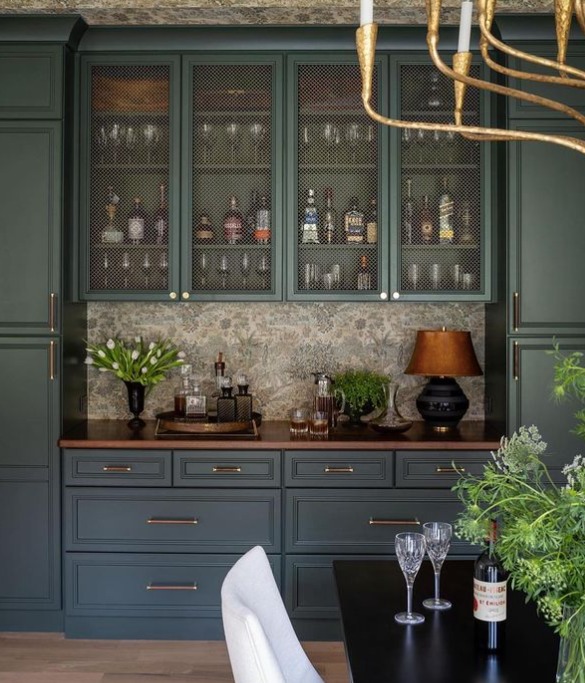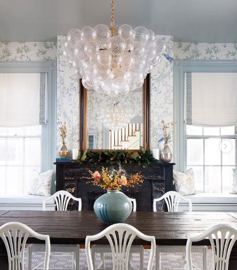 3. Watercolor Blue For a subtle touch of blue in your dining room, explore the whimsical watercolor-like space from @julieneilldesigns. Cullum recommends Benjamin Moore’s Harbor Haze and Imperial Garden Blue botanical wallpaper, creating a misty gray-blue ambiance that pairs elegantly with chinoiserie wallpaper against a creamy white background.