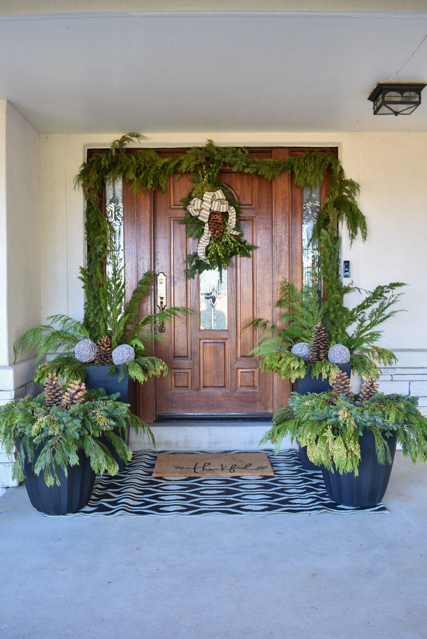 Earthy porch decor is understated but impactful—the epitome of quiet luxury—thanks to fresh, not fake, evergreens.