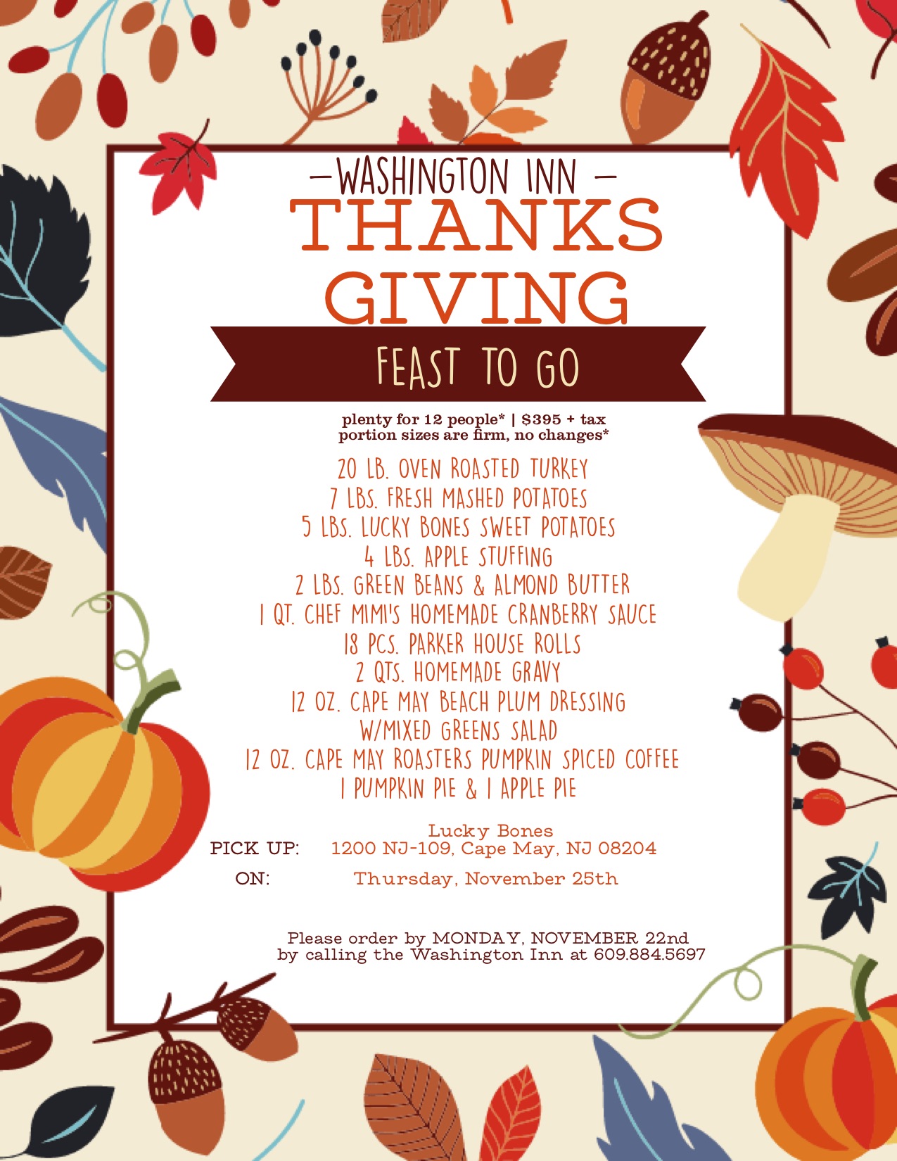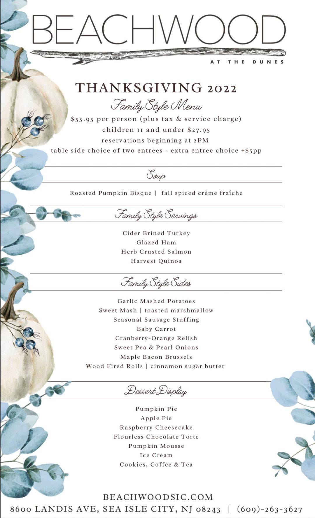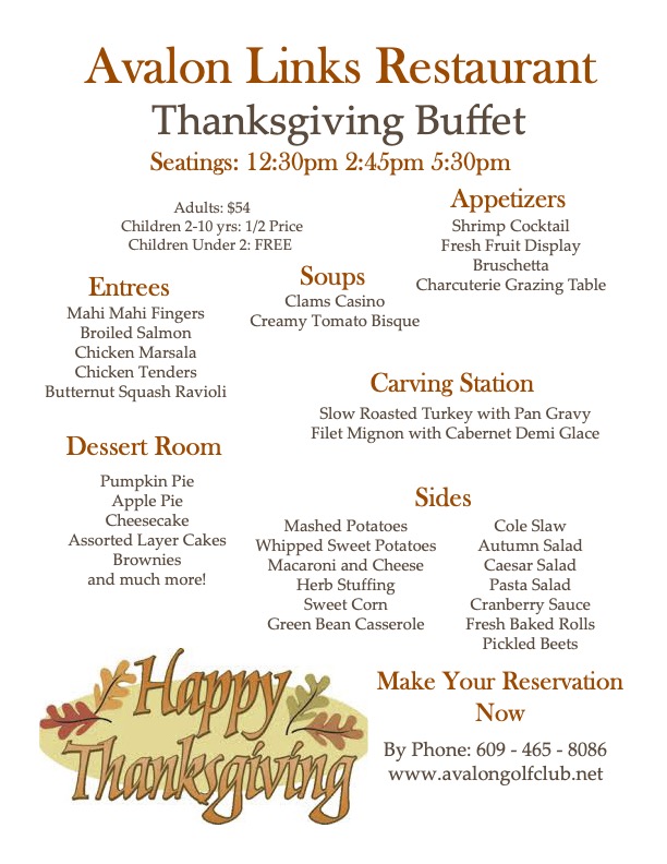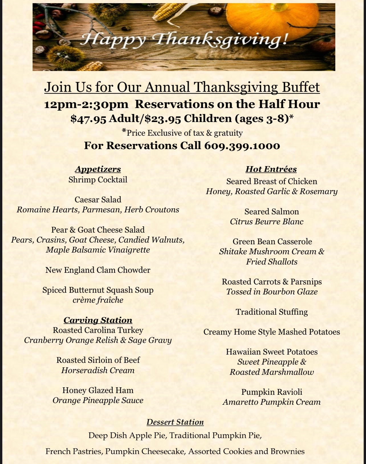 Call (609) 884-6542 for Thanksgiving Dinner reservations.