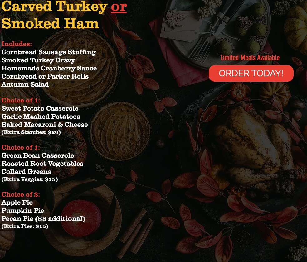 Smoked Turkey Meal $199 serves 6 to 8!